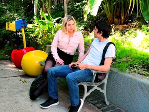 Jodie Stacks e Bruno Dickemz em My Friends Hot Mom, Jodie Stacks, precisam de muito para fazer no jantar que vai dar esta noite, mas quando chega em casa, seu enteado Levi ainda está sentado no sofá. Ele está assistindo ao jogo com seu amigo Bruno, mas Ms