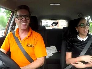 Fake Driving College - Gata europeia de cabelo preto com óculos fodida no carro