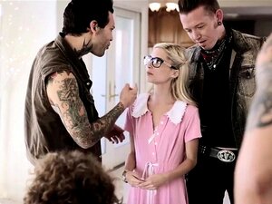 Vadia extra pequena e fofa é corno por pervertidos na frente do namorado. Vadia loirinha extra Piper Perri com peitinhos pequenos em óculos é corno por três pervertidos tatuados para salvar a vida do namorado nerd